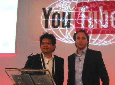 The YouTube founders Chad Hurley and Steve Chen are now on stage. Steve starts by talking about the YouTube mission, and why they started the site. Back in January 2005, they were having a dinner party and took pics and videos of each other. They found it easy to share pics online, but videos were more difficult; they were too large to email, codecs and transcoding was complicated. Back then they figured more and more people would have this problem so they sought a solution, and came up with YouTube. The mission is still the same, they say: listen to the community and continue to innovate.
